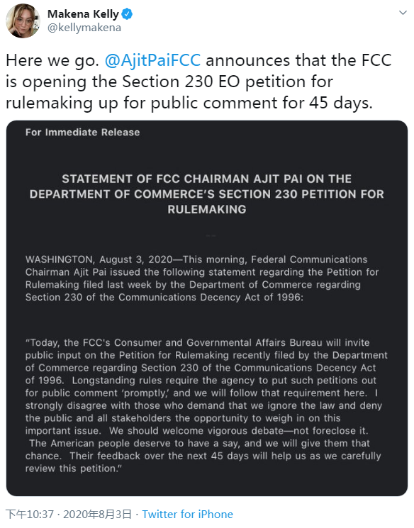 美国联邦通信委员会(FCC)主席 Ajit Pai 周一表示,该机构将对特朗普政府提交的请愿书开展为期 45 天的公众意见咨询。据悉,该请愿书旨在寻求新的透明度准则,以规范社交媒体公司对平台上的内容进行监管。而反对此举的民主党人,此前曾希望 FCC 在不开展公众评议的情况下立即驳回该请愿。