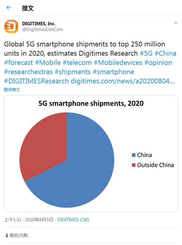 8月4日,据外媒报道,来自Digitimes Research的最新预测显示,2020年5G智能手机出货量将突破2.5亿部,仅中国就占1.7亿部。报道称,Digitimes Research预测,受疫情影响,2020年,全球智能手机出货量为11.5亿部,同比下降15.2%。2020年,5G智能手机出货量将突破2.5亿部,占据全球智能手机出货量的20%以上。