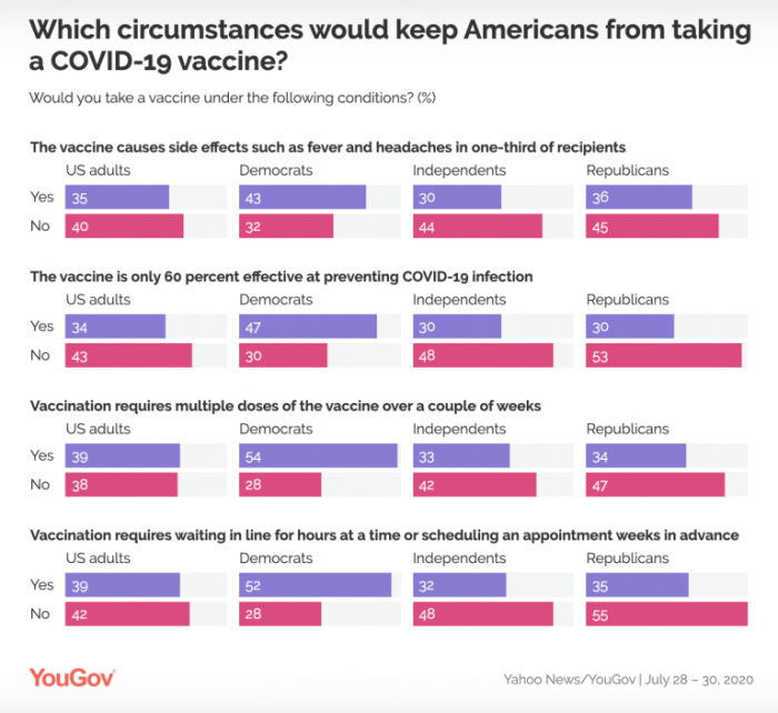 在7月初,这个数字已经下降至46%。而现在,在7月28日至30日进行的雅虎新闻/YouGov最新民调中,只有41%的美国人表示计划接种新冠疫苗,这是迄今为止这项民调获得的最小份额。