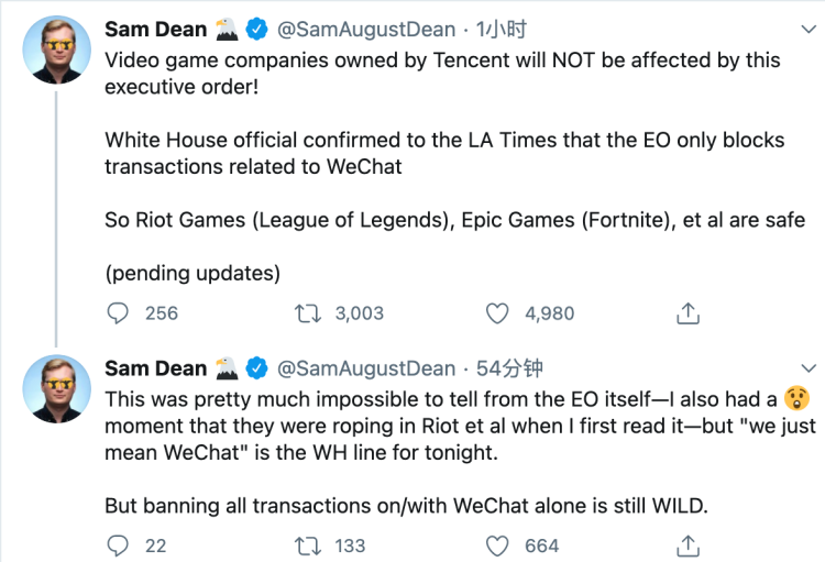 据洛杉矶时报记者Sam Dean消息,白宫官员表示总统令仅限微信以及微信相关公司,不涉及腾讯持股的游戏公司。因此,Riot公司的《League of Legends》和Epic公司的《Fortnite》目前暂不受影响。