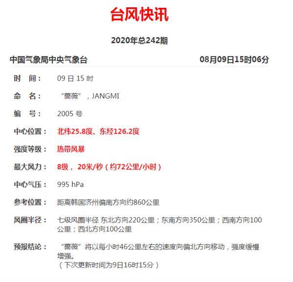根据中央气象台消息,菲律宾东北洋面热带低压于今天(9日)凌晨加强为今年第5号台风“蔷薇”(热带风暴级)(英文名称:Jangmi;名字来源:韩国;名字意义:花名),凌晨2点钟其中心位于日本冲绳县那霸市南偏西大约650公里的洋面上,北纬20.5度、东经126.3度,8级(18米/秒),998百帕。