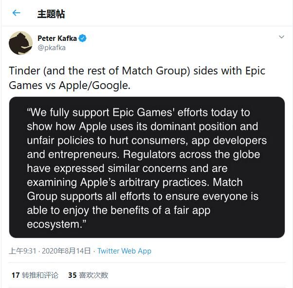 此外,知名约会应用 Tinder 也明确表示支持 Epic,声明中写道