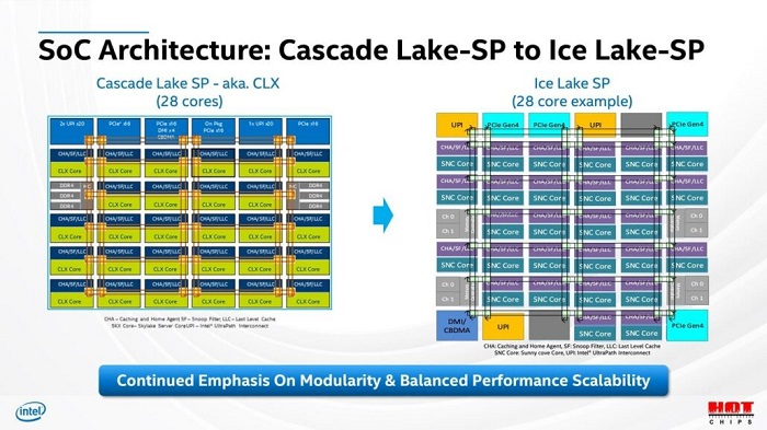 在 HotChips 32 活动期间,英特尔公布了代号为 Ice Lake-SP 的新一代至强处理器的详情。定于今年晚些时候到来的该服务器芯片产品线采用了 10nm 制程,具有改进的 Sunny Cove 内核架构和一系列新功能,辅以 I/O 和软件堆栈方面的增强。英特尔在演示文稿中拿 28 核心的 SKU 举例,且 Whitley 服务器平台上可选基于单路 / 双路插槽的方案。