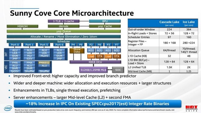 据悉,Sunny Cove 架构较 Cascade Lake 和 Skylake 提供了一系列改进。前端方面,其具有更高的容量和改进的分支预测器。