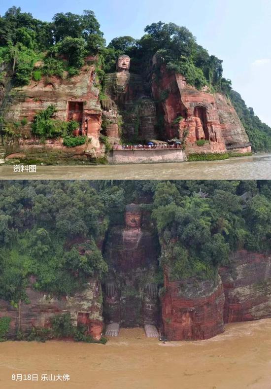 据乐山大佛景区管委会消息,这是1949年来,乐山大佛首次被洪水淹至脚趾。