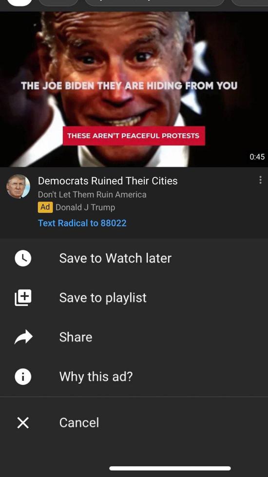 民主党正式提名拜登为总统候选人,特朗普这边也没有闲着。美国网民今天发现,一旦进入视频网站YouTube首页,就会自动播放特朗普团队投放的攻击拜登的政治广告。如果启用Adblock屏蔽页面广告,虽然画面没有显示,但是该广告的声音依然在播放。