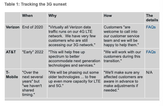 重要的是,所有这些运营商已经向关闭3G网络迈出了重要的第一步:他们不再激活任何3G设备。这是无线网络运营商过渡至新技术时普遍会采取的行动--通常他们会在网络真正关闭的前几年采取这一措施,因为他们假定大多数用户会在服务关闭之前自然升级到支持更新技术的终端设备。