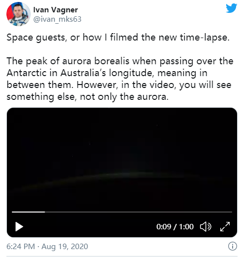 据俄罗斯卫星通讯社报道,俄罗斯宇航员伊万·瓦格纳(Ivan Vagner)目前正在国际空间站(ISS)上绕地球飞行,他声称在拍摄极光时,意外发现了不明飞行物(UFO)。周三早上,瓦格纳在推特上发布了这段视频。瓦格纳称,这段一分钟的视频拍摄的是经过南极洲和澳大利亚附近时的极光。