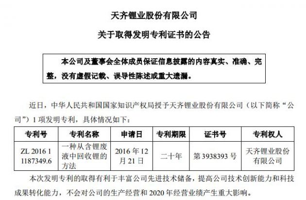 8月23日消息,特斯拉供应商、深交所上市公司天齐锂业发布公告称,它获得了一项名为“一种从含锂废液中回收锂的方法”的发明专利。该公司在公告中表示,该专利的专利号为“ZL 2016 11187349.6”,专利期限为二十年。