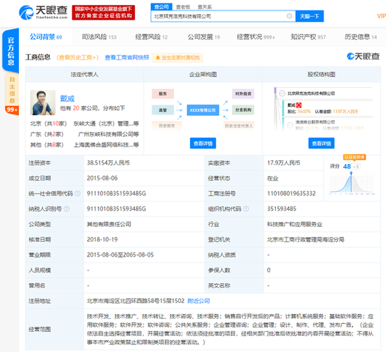 天眼查App显示,北京拜克洛克科技有限公司成立于2015年8月,注册资本约38.52万人民币,公司经营范围包括:技术开发、技术推广、技术转让、技术咨询、技术服务;销售自行开发后的产品;计算机系统服务;基础软件服务等。在其股东信息中,戴威持股36.02%为该公司最大股东,第二、第三大股东为滴滴商业服务有限公司、北京经纬美创科技有限公司,持股比例分别为25.32%、10.15%。