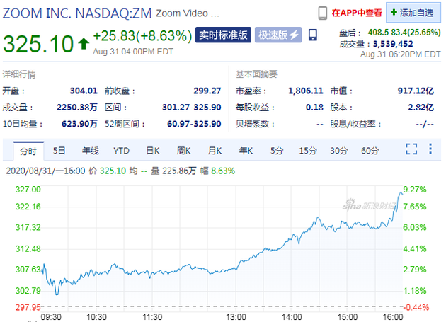 视频会议软件开发商Zoom今日盘后公布了2021财年第二季度财报,财报超出市场普遍预期,同时Zoom上调了全年业绩指引。截止发稿,Zoom盘后股价大涨25%。当日,Zoom股价在纳斯达克常规交易中上涨25.83美元,报收于325.10美元,涨幅为8.63%。过去52周,Zoom最高价为325.90美元,最低价为60.97美元。