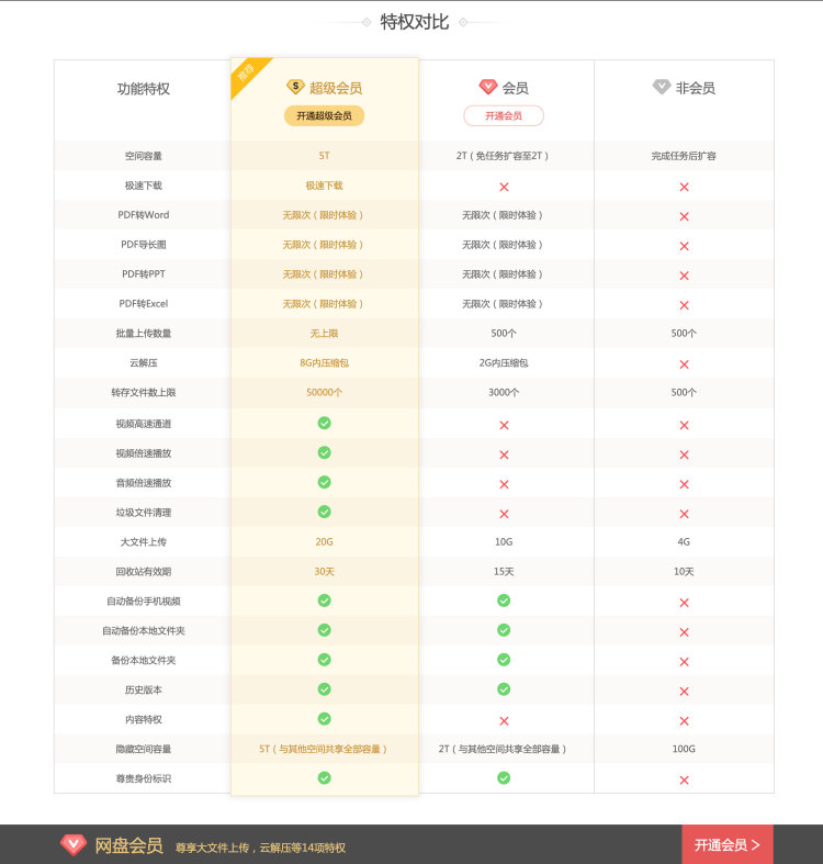 但是,百度网盘持续烧钱带来的大量活跃用户数,并不代表就获得了用户的认可。首先是会员大容量储存空间的起步,抬高了购买的价格,普通会员年收费为99元,网盘容量为200G,超级会员为298元,享受5T的网盘容量,而极速视频、云解压和音频类服务,只有开通百度网盘超级会员才能使用。相比之下,小米云服务和iCloud在中国内地都设定了50G的购买服务,前者一年仅49元,后者只需要72元,这让百度网盘的用户抱怨颇多。