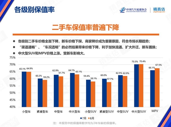 在各个级别的保值率中,以三年车龄的保值率来看,中大型SUV车型的保值率最高,达到了70.4%;其次为MPV车型,为67.5%;再然后为小型车的64.9%,均超过了燃油车的平均水平。