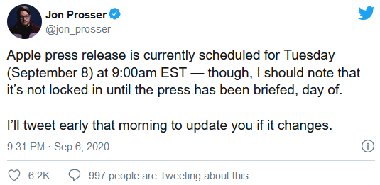 多产的泄密者乔恩·普罗瑟(Jon Prosser)透露,苹果计划在本周二召开发布会,公布新的iPad和Apple Watch型号。Prosser解释说,苹果计划在美国东部时间9月8日星期二9:00召开新闻发布会,但他指出,这一天实际上本身并没有被 "锁定",如果有更新,他将提供最新消息。