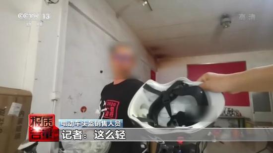 电动车头盔销售人员:这就是夏盔,没有太多东西(填充物),不像专业的摩托车头盔里面填充物多,它沉,就是电动车头盔。