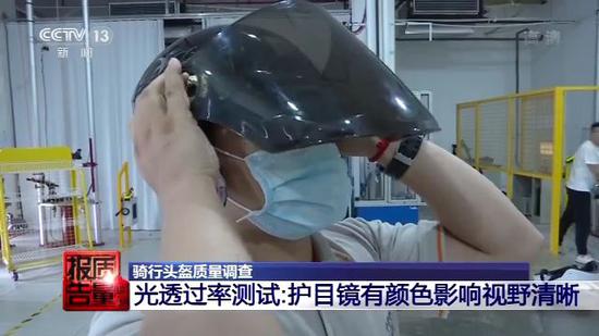 记者在市场调查过程中发现,大部分电动车头盔还配有茶色或其他颜色的护目镜。测试工程师告诉记者,其实护目镜的光透过率也直接影响着骑行安全。这款头盔的护目镜在测试中,光透过率只有20.76%,距离国家标准要求的安全数值相差很大。