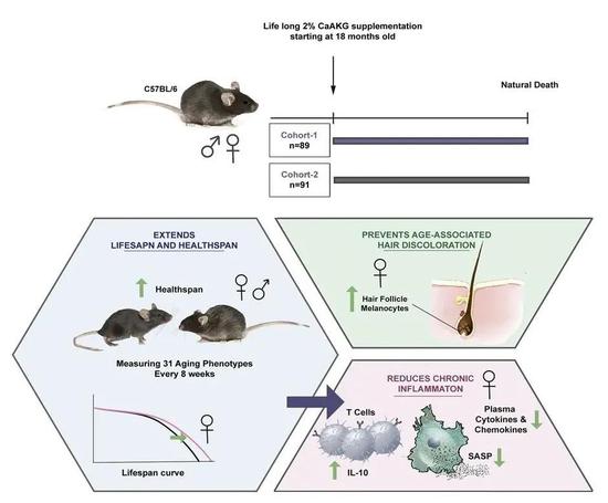 由于一般的食物中没有发现AKG,因此科学家们从小鼠18个月大时(相当于人类的50多岁)开始,每天通过添加CaAKG(AKG的钙盐形式)进行补充,直至小鼠去世。