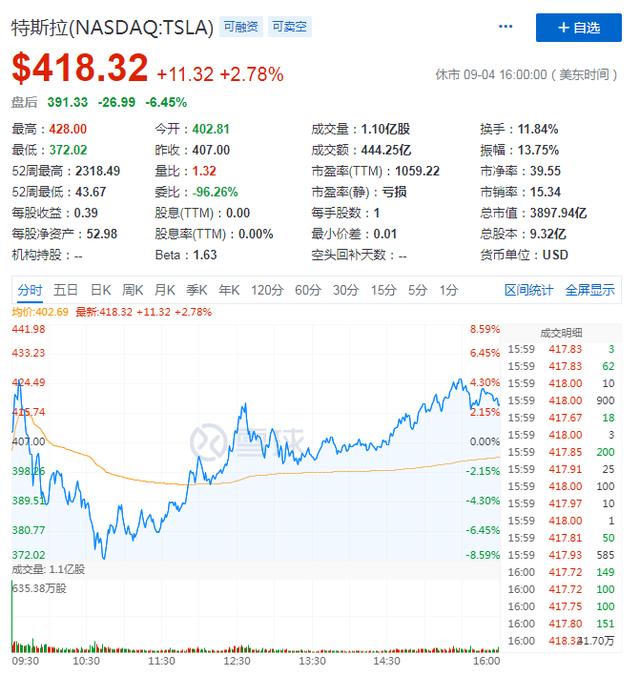 因落选标普500指数,再加上受美股大盘全线暴跌影响,特斯拉股价盘后暴跌。截至目前,特斯拉周五盘后股价为391.33美元,盘后下跌6.45%,市值为3897.94亿美元。
