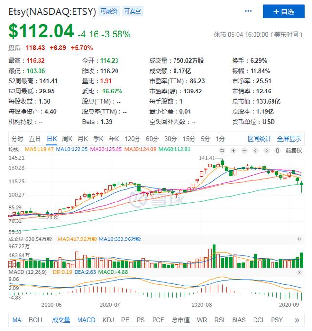 Etsy是美国一个在线销售手工工艺品的网站,网站集聚了一大批极富影响力和号召力的手工艺术品设计师。步入5月以来,Etsy股价就进入刷新历史新高的轨迹。从60到70到80,直到现在股价来到112美元。截止目前,Etsy周五盘后股价为118.43美元,市值为133.69亿美元。