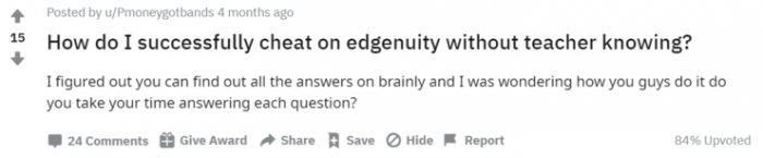 另外,在4个月前,还有学生公然在Reddit上发布帖子,询问如何利用Edgenuity作弊。