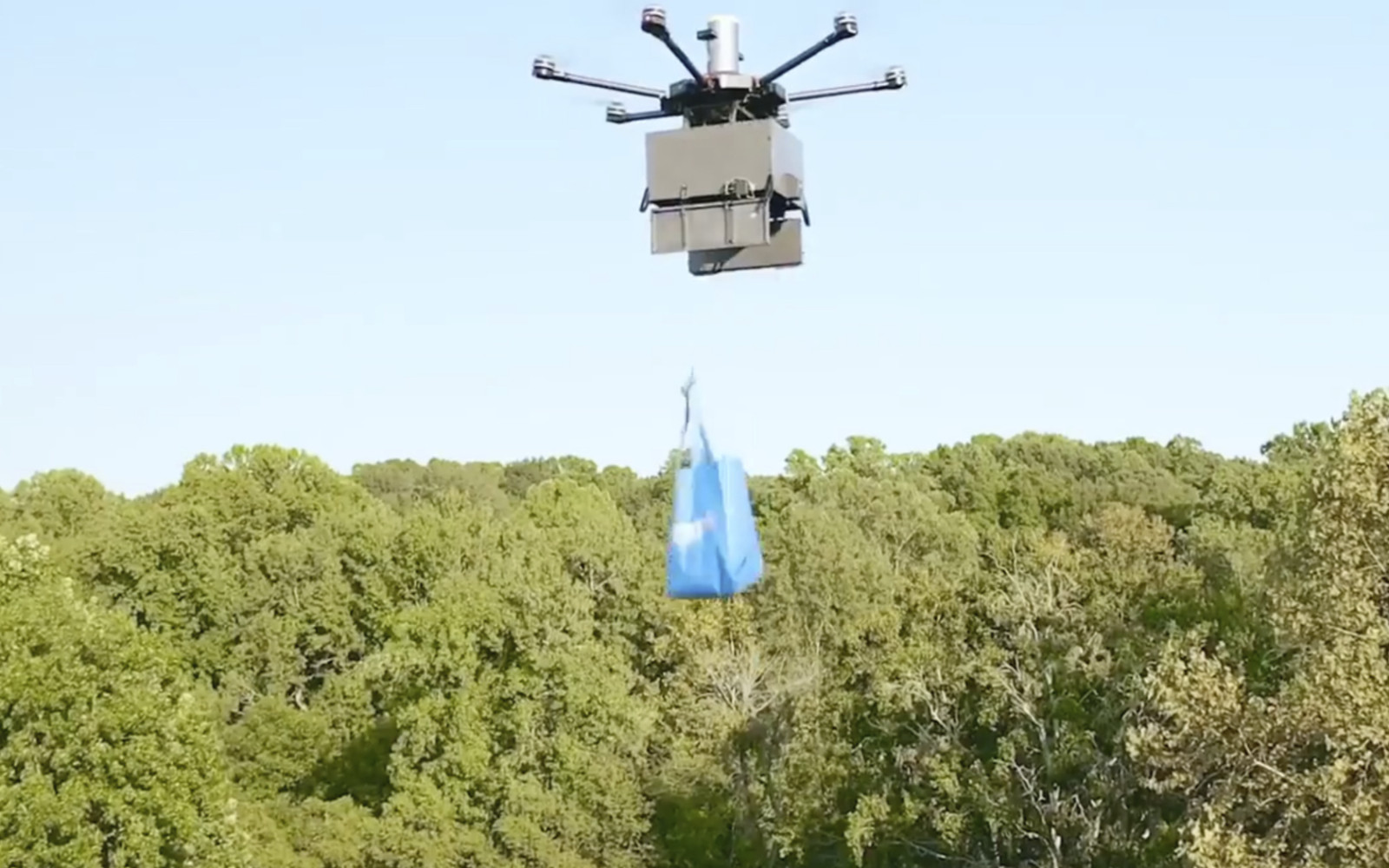 无人机本身比典型的DJI、Skydio或Parrot消费机型更大。它们可以使用六个旋翼以高达32英里/小时的速度飞行,装有沃尔玛订单的快递箱安装在下面。当它们到达目的地时,它们的设计并不是为了降落,无人机悬停在八十英尺的空中,并且将货物通过绳子放到地面。