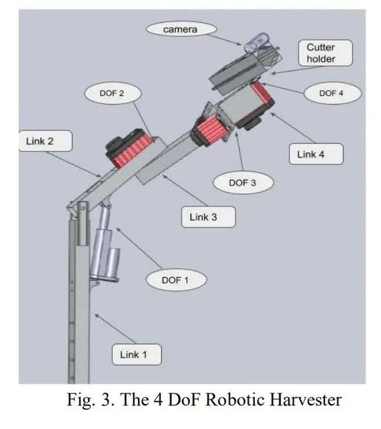 Robotic Harvester 是一个有四个自由度的机器臂,还配有一个旋转式切割机(rotary cutter)作为末端执行器(end effector)。
