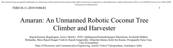 论文一作、印度甘露大学(Amrita Vishwa Vidyapeetham University)助理教授 Rajesh Kannan Megalingam 表示,该团队从 2014 年就开始研发这款机器人了。他说道:“世界上不存在两棵完全相同的椰子树。除了大小不同,椰子簇和叶片的排列也是独一无二的。所以,设计出一款完美的机器人极具挑战性。”