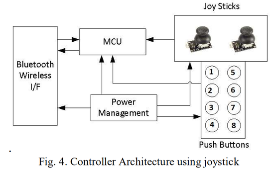 下图 4 为操纵杆控制器的原理图,包含五个重要的组件,即操纵杆、MCU(微控制单元)、蓝牙、电源管理和按钮。
