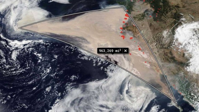 巨大的烟云总共覆盖了963269平方英里。到目前为止,今年仅在加州就有310万英亩的土地被烧毁。这个数字比起截至9月9日加州250万英亩的燃烧面积有了大幅增加。俄勒冈州也在与大规模的火灾作斗争,该州有805314英亩的土地被烧毁。在华盛顿州,有50万英亩的土地被烧毁。