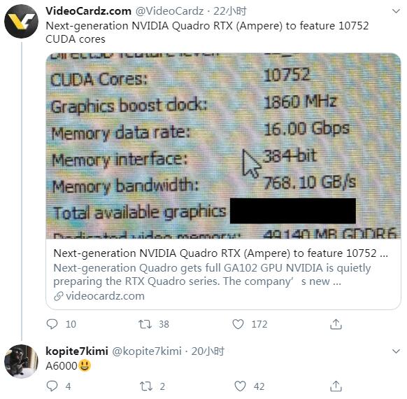 然而在 VideoCardz 转发后,网友 @kopite7kimi 表示,这张显卡或以 Quadro RTX A6000 的名义上市,意味着后续可能还有 Quadro RTX A8000 等更高端选项。