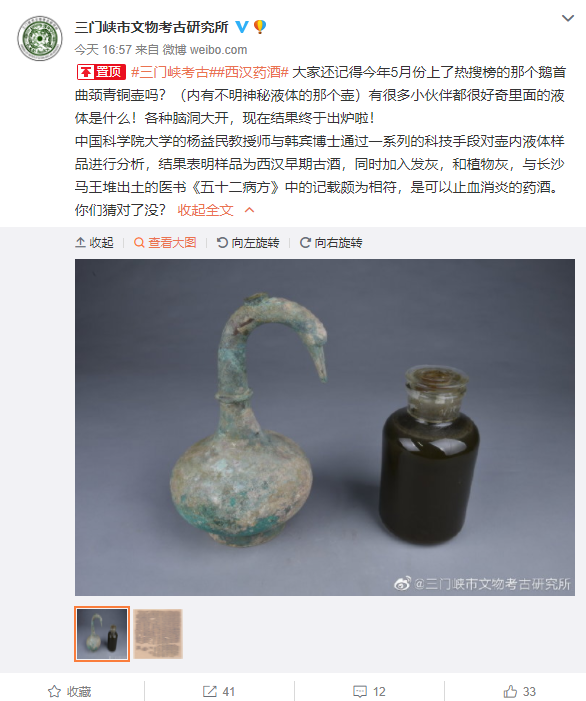 从三门峡市文物考古研究所获悉,经中国科学院大学研究人员取样检测,鹅首曲颈青铜壶内的液体为西汉早期的古酒,并与湖南长沙马王堆汉墓出土的医学方书《五十二病方》中的相关记载颇为相符,是可以止血消炎的药酒。