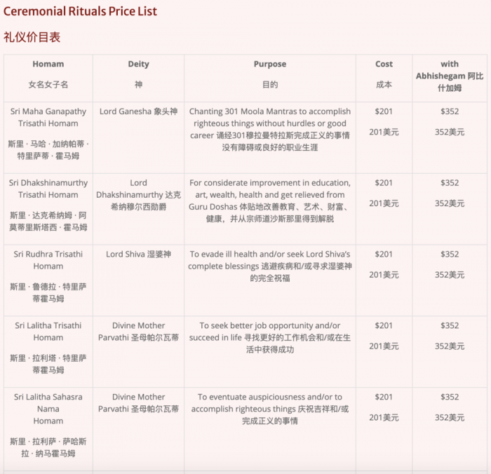 在印度一家宗教服务垂类电商报价单里,你能清晰看见印度人对于祈福业务的精细化划分,如果加上灌顶仪式价格会更高。