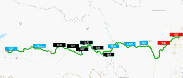 依次建设在成都、雅安、康定、新都桥、理塘、巴塘、芒康、左贡、八宿、波密、鲁朗、工布江达和拉萨。
