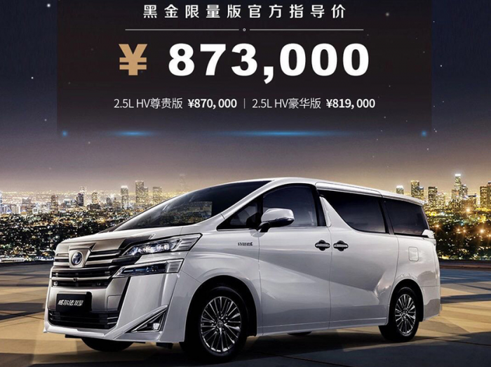 9月22日消息,丰田威尔法黑金刚限量版车型正式上市,新车共推出一款车型,售价为87.3万元,官方表示该车将于10月开售。