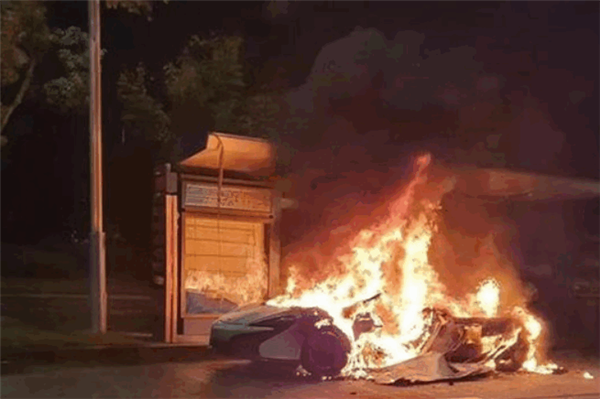 在刚起火初期,火势相对较小,车上人员打开了车门及时离开。随后,火势突然变大,整车后部被大火吞噬。