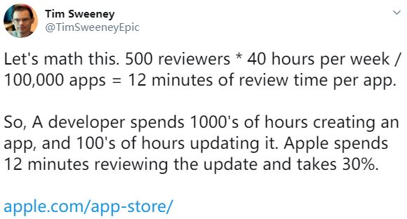 苹果官网这样写道“每周会有来自全球的500余名专家对超过10万款APP进行调研”,Tim Sweeney 针对这一数据进行了缜密的计算,表示苹果花在每一款APP上的时间只有12分钟,却拿走了30%的分成。