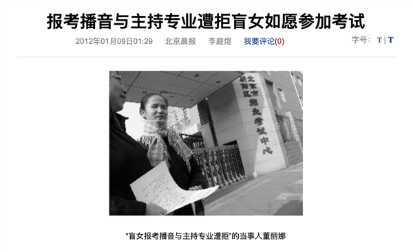 正因如此,为了改变命运董丽娜在2011年决定参加高教自考播音与主持专业的本科考试,但却因视力障碍和相关部门“没有先例”的说法遭拒。最后才在媒体的广泛报道下,获得参加自考的权力。