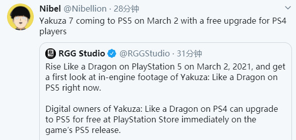 世嘉今日公布了《如龙7》PS5版发售日。本作是XSX/S首发游戏,但对于PS5版,则是2021年3月2日推出,基本上算是比XSX版晚来了4个月。同时世嘉还确认,购买PS4数字版《如龙7》的玩家可以在PS版发售时在PS商城免费升级至PS5版。