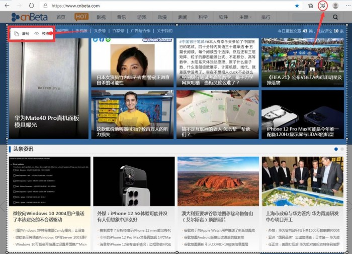 今天,微软正式介绍了该功能,并将其引入到 Dev 和 Canary 频道版本中,该工具位于右上方的省略号图标(...)访问的设置菜单中,也可以固定在工具栏上。选择该图标会自动将屏幕切换到捕捉模式,用户可以轻松地拖动选择他们想要捕捉的内容。