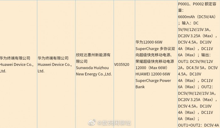 据知名博主@数码闲聊站 爆料,华为超闪移动电源来了华为和荣耀都有认证,输入输出功率11V 6A最高66W,标准值12000mAh额定值6600mAh。华为系明年新机的主流快充方案应该就是22.5W/40W/66W,全员新电荷泵方案。
