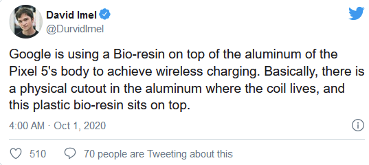 谷歌向某些媒体成员透露,Pixel 5的金属机身背面开了一个窗口,充电线圈就嵌入其中。然后再涂上一层 "生物树脂",以保证外观和表面的统一,并防止充电线圈受到任何损伤。