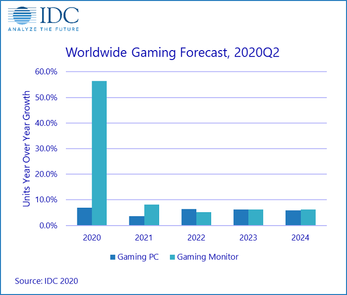 突如其来的疫情,让不少人在今年很长时间内都只能居家办公,而这样的环境也直接刺激了游戏市场。随着游戏市场的火热,也直接带动了游戏PC出货量的暴增。IDC给出的报告显示,本年度游戏PC与显示器的出货量将同比增长16.2%、至4960万台。到2024年的时候,出货量有望继续增长至6190万台,复合年增长率(CAGR)为5.7% 。