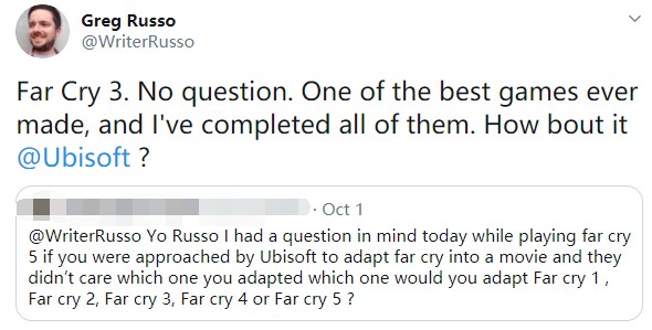 对此Russo表示毫无疑问是《孤岛惊魂3》,而且他认为本作是最好的游戏之一,并且他通关了系列从一到五代的所有游戏。他还在推特上@了育碧,问道:“如何?”