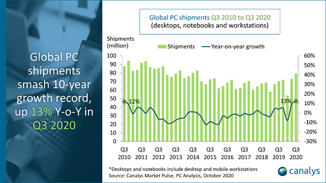 截至 2020 年 3 季度,全球笔记本电脑出货量达到了 6400 万台,几乎超过了 2011 年 4 季度创下的 6460 万台的历史新高。
