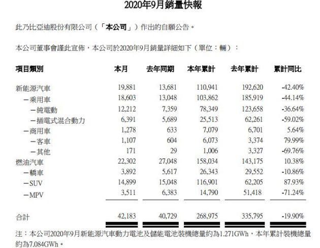 电动汽车制造商比亚迪发布公告称,今年9月份,该公司的新能源汽车销量为19881辆,与去年同期的13681辆相比,同比增长45.32%。比亚迪表示,今年前9个月,该公司的新能源汽车销量累计为11.0941万辆,与去年前9个月的19.262万辆相比,同比下降42.4%。