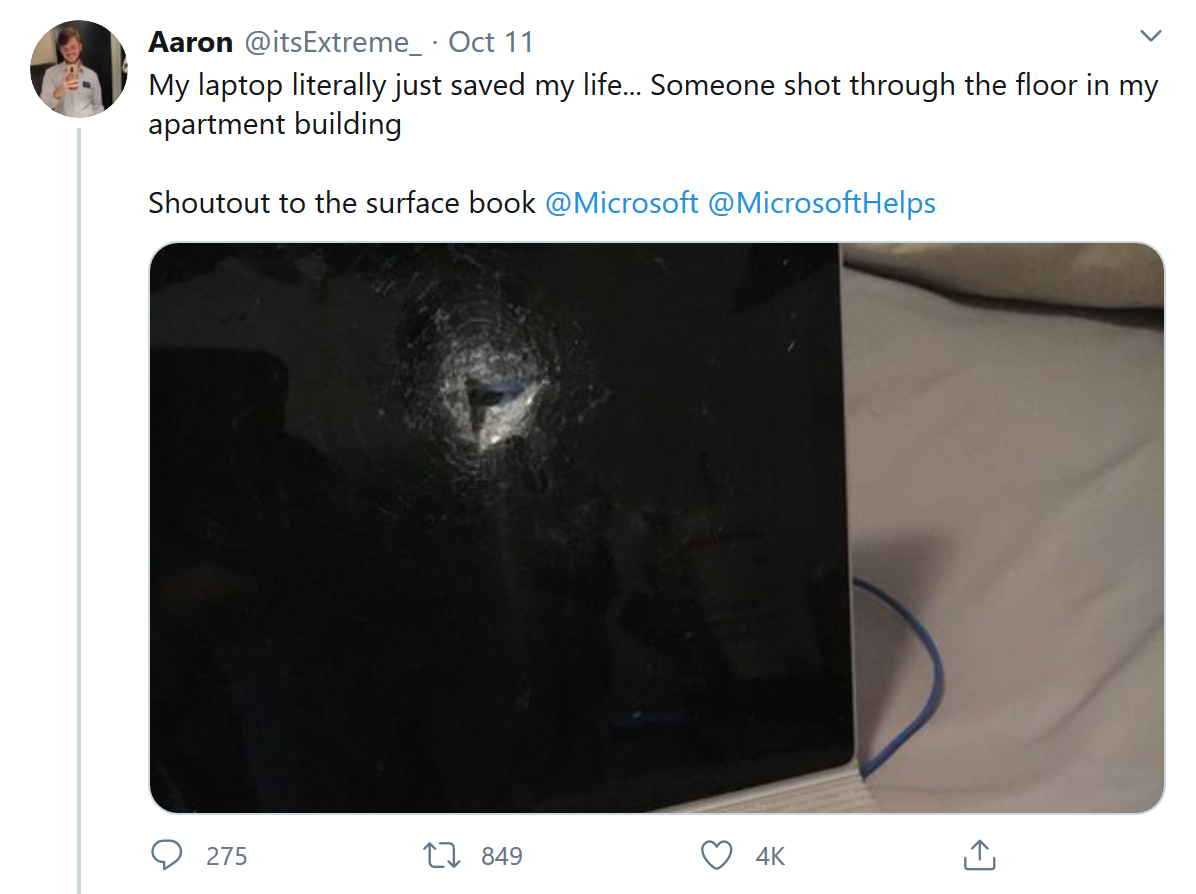 据外媒报道,根据Twitter上的用户Aaron称,微软的Surface Book不仅非常坚固,同时它还具备防弹能力。据其披露,一颗流弹从他下面的公寓射穿了他的地板和床,最终他的Surface Book笔记本电脑挡住了这颗子弹。