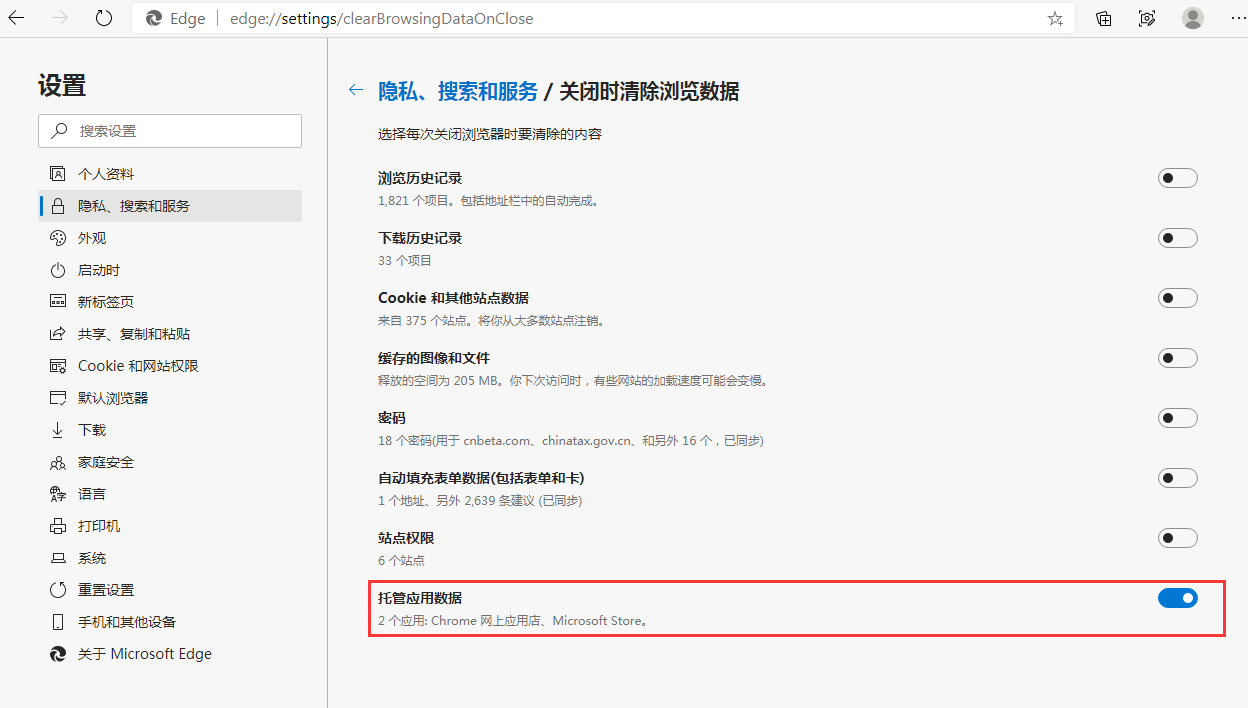 2.在地址栏上访问edge://settings/clearBrowsingDataOnClose