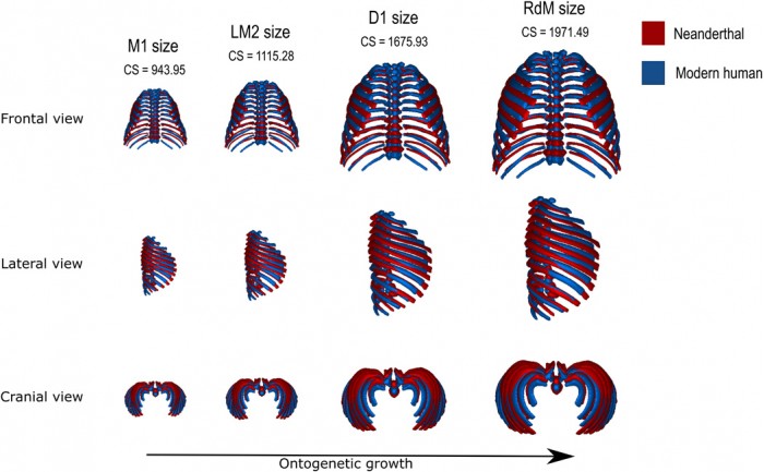 为了研究这个问题,马丁内斯和国际同行合作,利用虚拟重建和传统的几何形态测量法,首次重现了4个尼安德特人的胸部形状,展示了尼安德特人胸部从出生到3岁的进化过程。研究结果表明,婴儿期尼安德特人的胸腔,就像下颌骨等其他解剖区域一样,已经呈现出与现代人类物种不同的特征;婴儿期尼安德特人胸腔跟现代人成年后的胸腔大小一样。