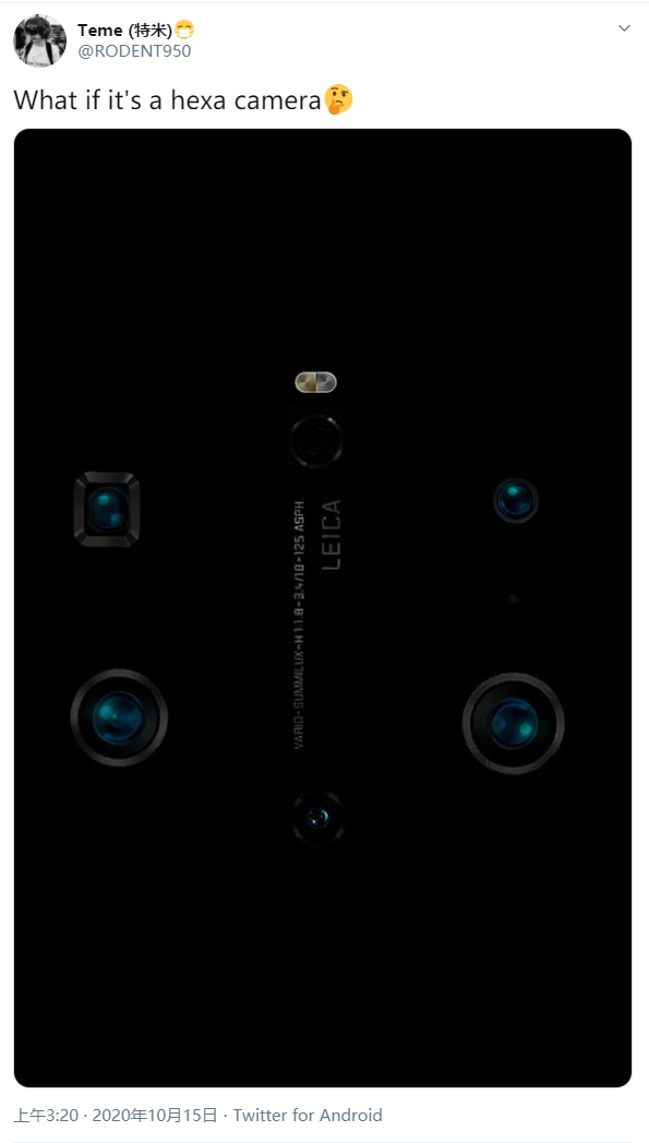 此前,华为P40 Pro+已经将摄像头数量堆到5颗,而最为史上最强到的Mate系列,华为Mate 40系列配备六摄的可能性极大。