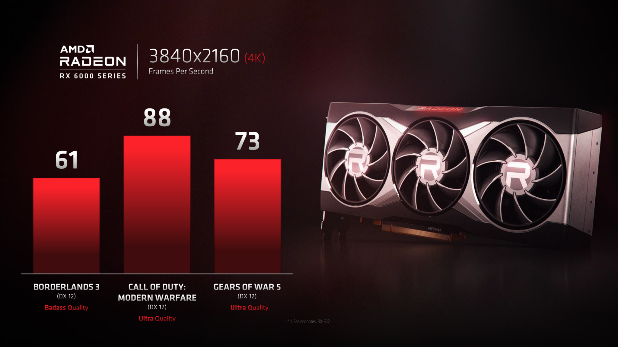 此前,AMD公布的数据显示,RX 6900 XT在4K下运行《无主之地3》《使命召唤16:现代战争》和《战争机器5》,帧数均超过了60FPS,表现趋近于RTX 3080。